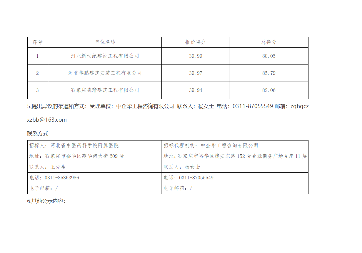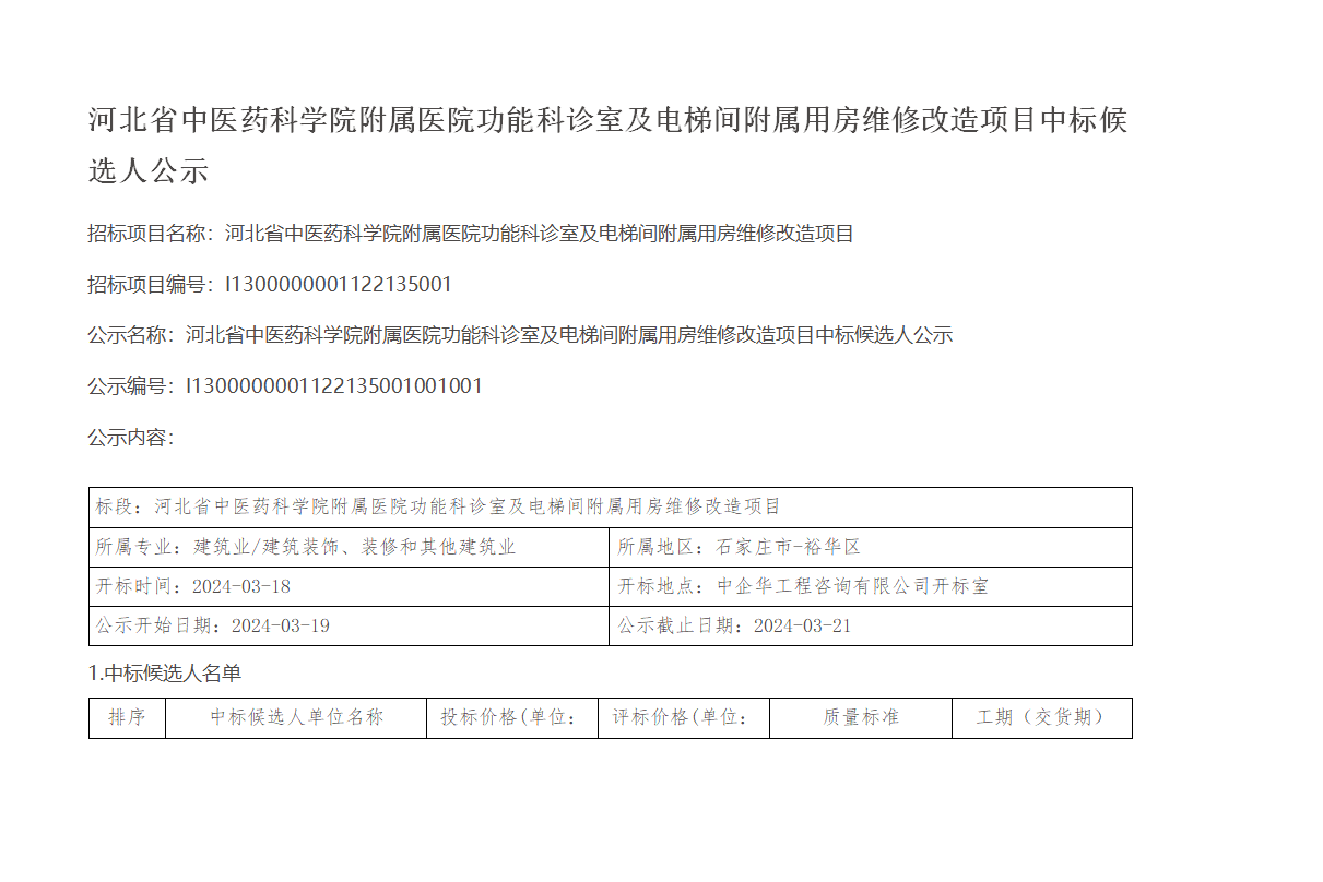 河北省中医药科学院附属医院功能科诊室及电梯间附属用房维修改造项目中标候选人公示