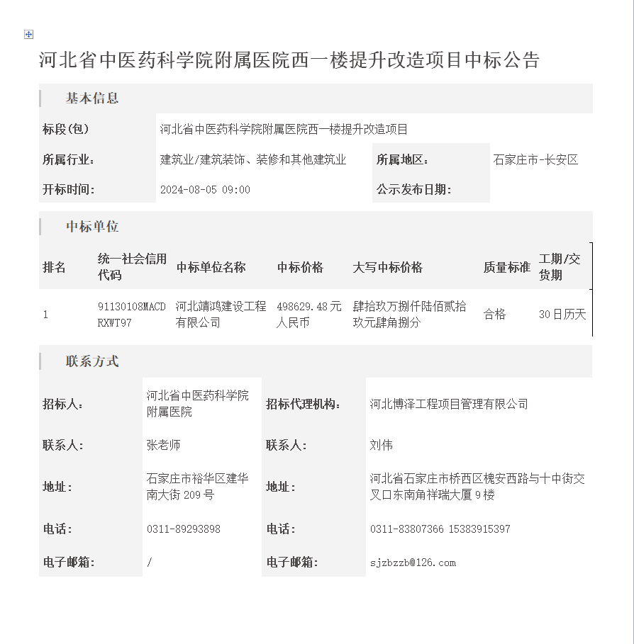 河北省中医药科学院附属医院西一楼提升改造项目中标公告