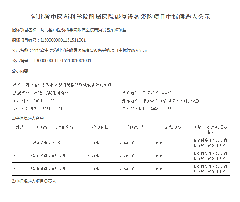 河北省中医药科学院附属医院康复设备采购项目中标候选人公示