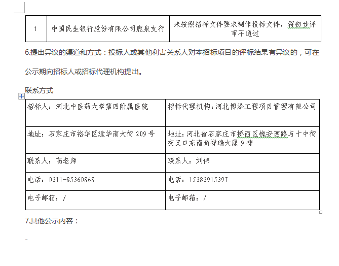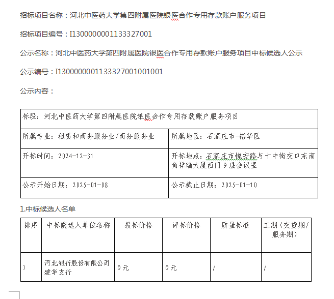 河北中医药大学第四附属医院银医合作专用存款账户服务项目中标候选人公示