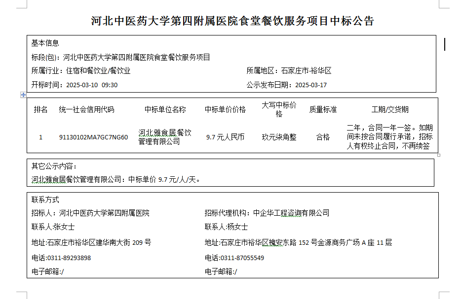 河北中医药大学第四附属医院食堂餐饮服务项目中标公告