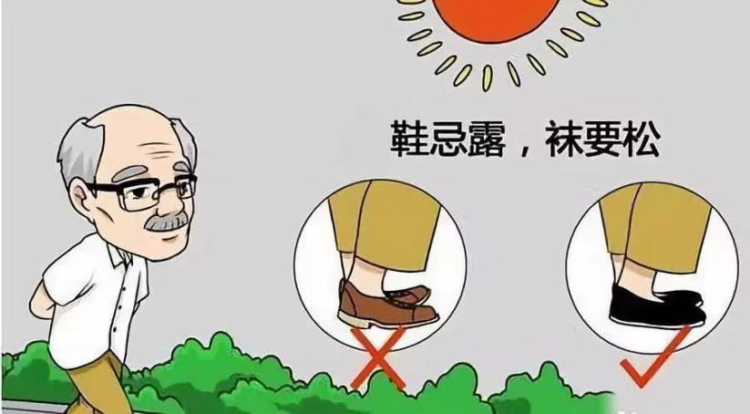 2、选择合适的鞋袜:穿着干净舒适的棉袜,袜子太紧会影响足部的血液循环。鞋子宜宽大一些,透气要好一些。穿鞋前应看一下鞋子里是否有异常,鞋跟不可过高。