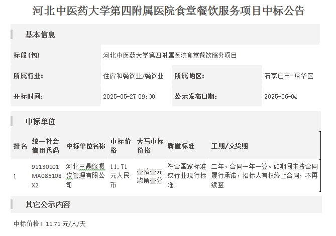 河北中医药大学第四附属医院食堂餐饮服务项目中标公告