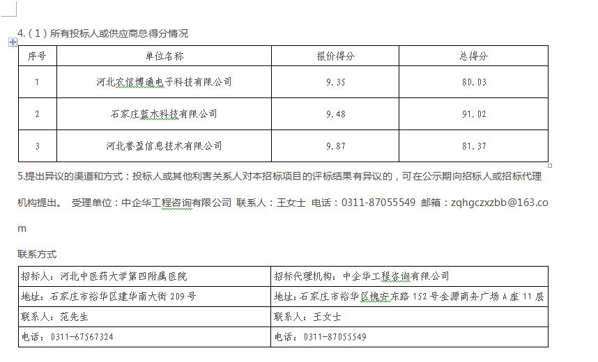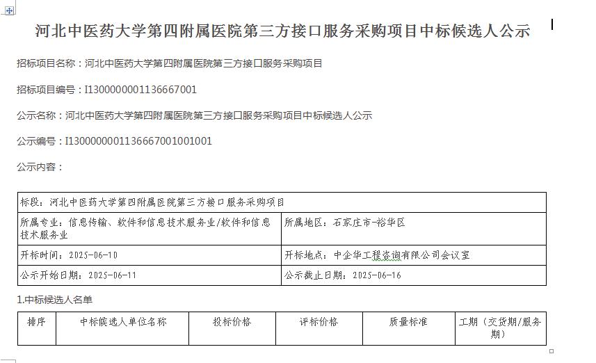 河北中医药大学第四附属医院第三方接口服务采购项目中标候选人公示
