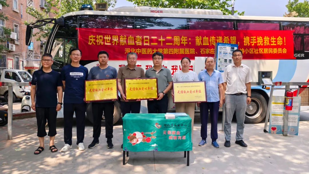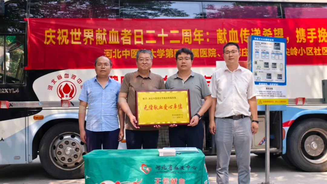 我院五名职工积极发挥模范表率作用,来到献血点参加无偿献血活动,以实际行动诠释了医者仁心和大爱无疆的精神。河北省血液中心也赠予了我院“无偿献血爱心单位”的荣誉牌匾。