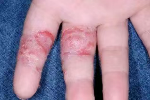 汗疱疹:多数表现为手掌、指缝对称性长的圆的成簇的小水疱,多伴有瘙痒及灼痛。