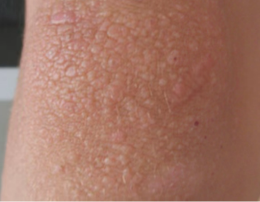 摩擦性苔藓样疹:又叫沙土皮炎,多发生于夏季,好发年龄为2~9 岁,以面部、手臂、膝盖和大腿内外侧,密密麻麻的丘疹和红斑为特征,多伴瘙痒。可以外用糖皮质激素或炉甘石洗剂,还要注意避免暴晒,塑料玩具、沙土刺激及地毯是最常见和主要的外界诱因。