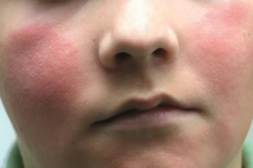 掌掴脸颊综合征(手拍样红斑):是由人类细小病毒B19引起,主要通过呼吸道传播,潜伏期1~2周,易在4~10岁儿童中发生流行。多伴发热、咽痛、呕吐等症状。这个病有自限性,明确诊断后大多数患者只需对症处理及支持治疗,一般预后良好,且感染后具有终生免疫力。