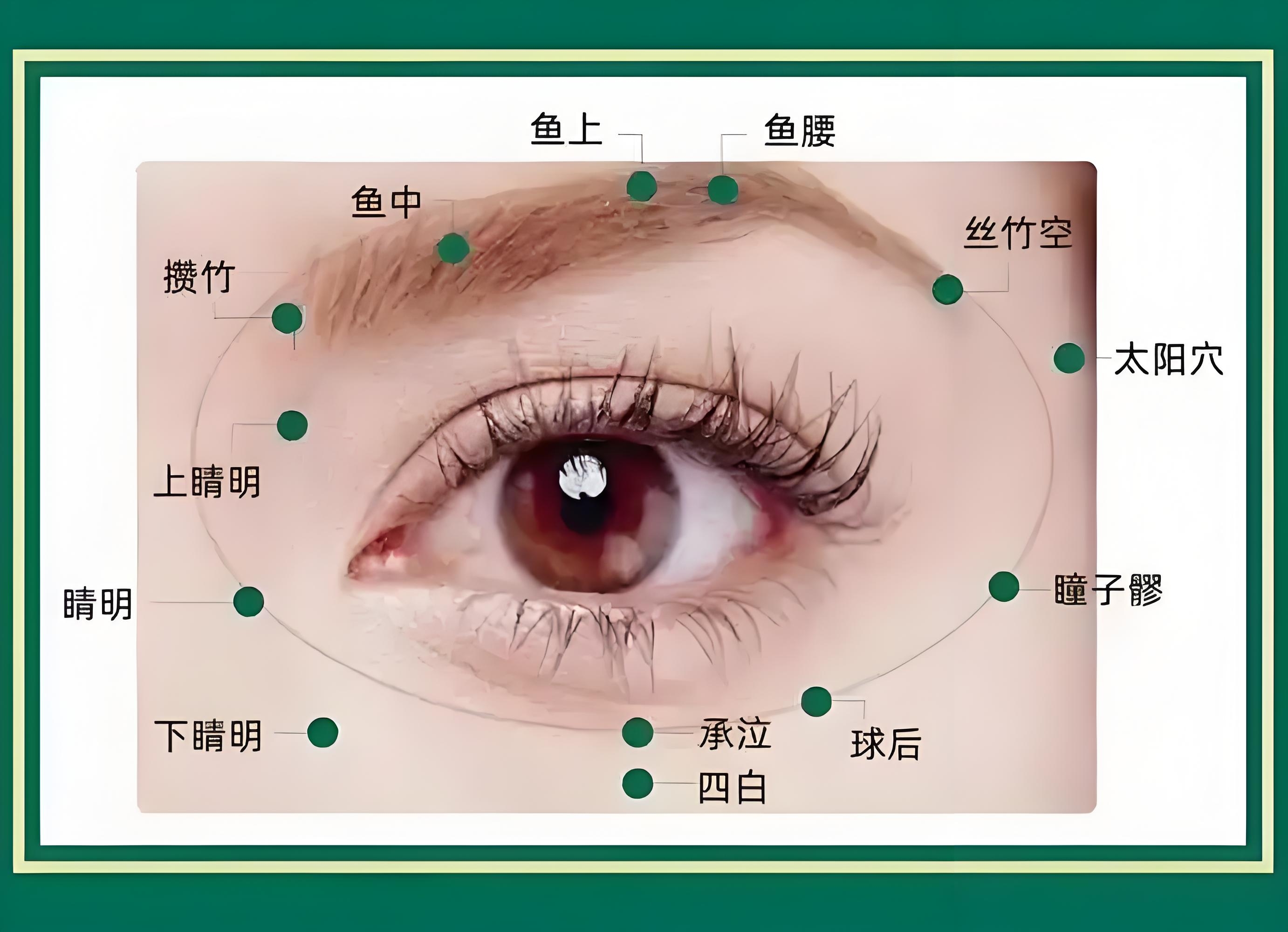 睛明穴(内眼角稍上方):双手食指轻柔点按,每次10秒,重复3次。缓解视疲劳、干涩。