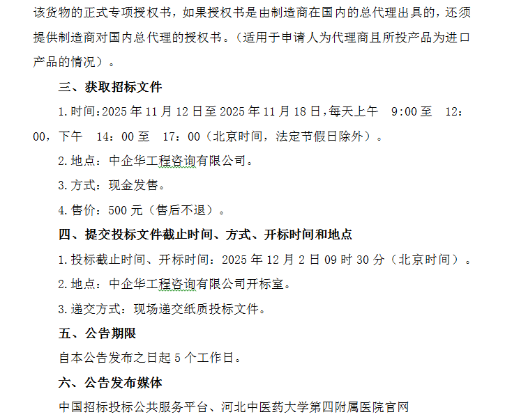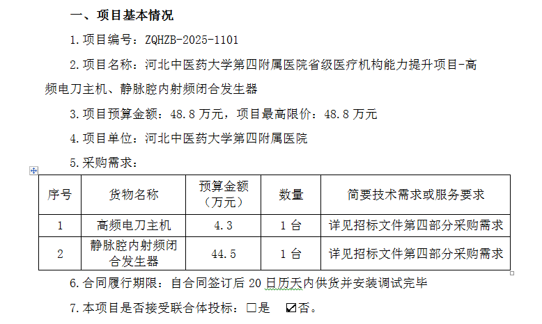 河北中医药大学第四附属医院省级医疗机构能力提升项目-高频电刀主机、静脉腔内射频闭合发生器招标公告
