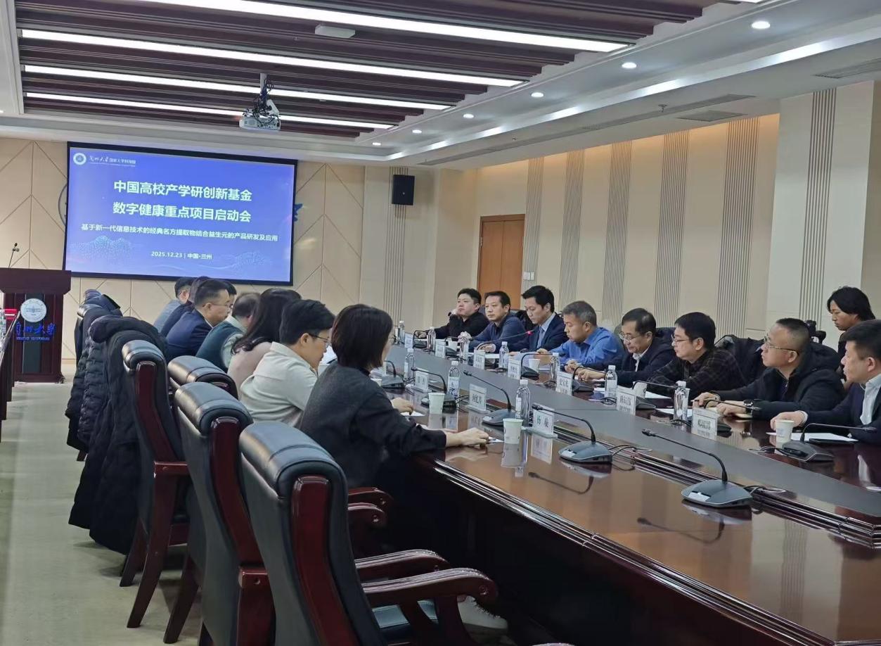 2025年12月23日,教育部高等学校科学研究发展中心设立的中国高校产学研创新基金数字健康项目——“基于新一代信息技术的经典名方提取物结合益生元的产品研发及应用”启动仪式暨项目论证会在兰州大学隆重举行。会议由兰州大学科学技术发展研究院副院长崔振凯主持,来自教育部高等学校科学研究发展中心、甘肃省科技厅、兰州市科技局、兰州大学、四川大学等高校、科研机构和企业的领导及专家,以及国医大师李佃贵教授等二十余人共同见证了项目启动,我院党委书记陈虎受邀出席。