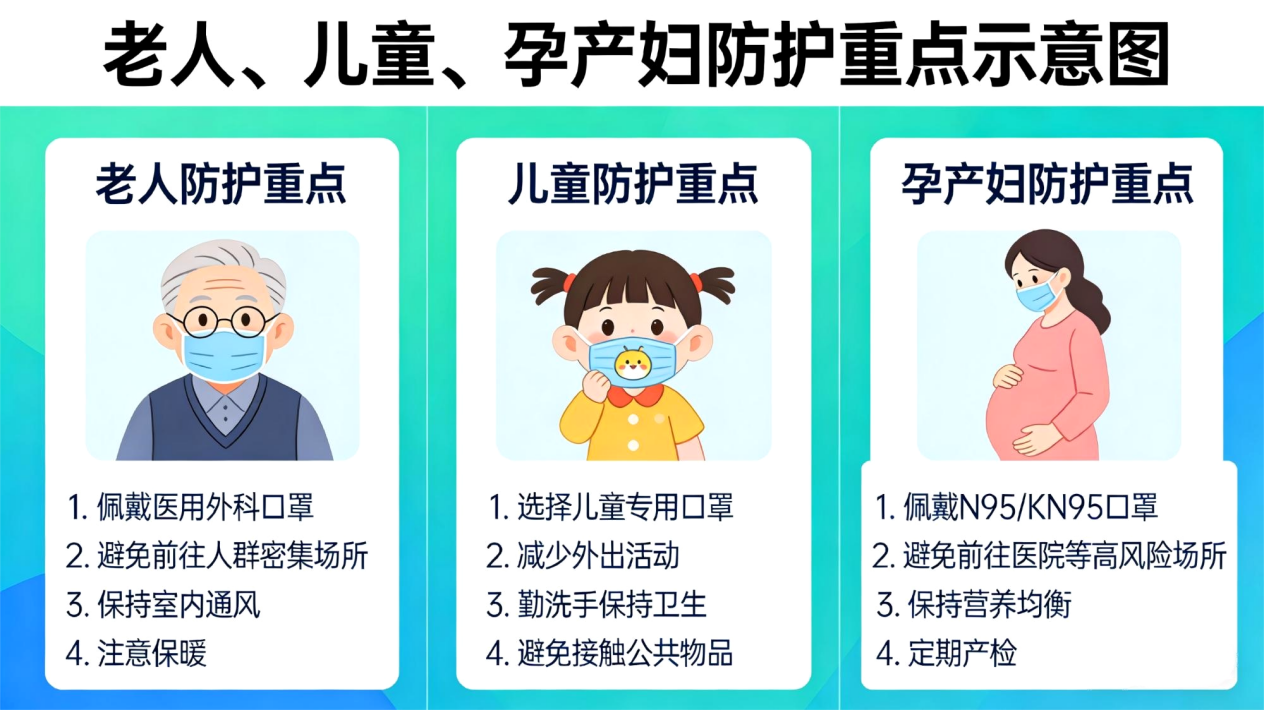 流感对全人群均易感,以下抵抗力较弱人群感染后,更易引发肺炎、心肌炎、呼吸衰竭等严重并发症,需重点加强防护: