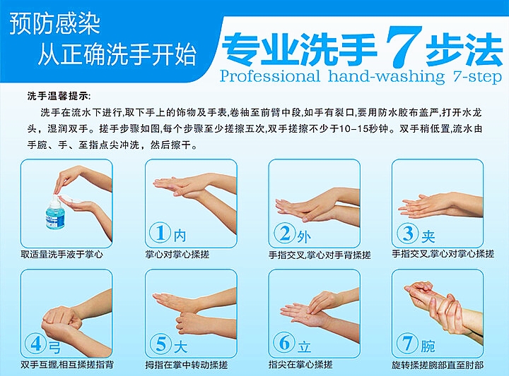 (2)规范手部卫生:坚持流动水搭配洗手液,按照七步洗手法洗手20秒以上,外出回家、饭前便后、护理老人儿童后必须洗手;