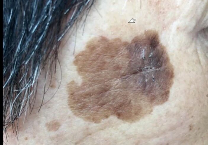 日光性黑子病:日光性黑子是长期紫外线累积导致的表皮色素沉着病变,属于皮肤光老化的常见标志,良性;好发于面部(颧骨、前额)、手背、前臂、上胸等光暴露区圆形 / 椭圆形斑,浅褐至深褐,边界清晰,表面光滑,无自觉症状;大小多为数毫米至数厘米。多见于中老年人,长期不防晒的年轻人也可出现。