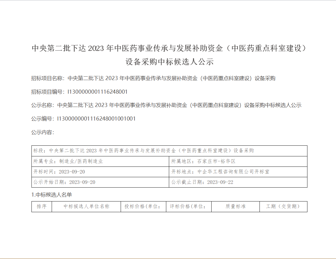中央第二批下达2023年中医药事业传承与发展补助资金(中医药重点科室建设)设备采购中标候选人公示