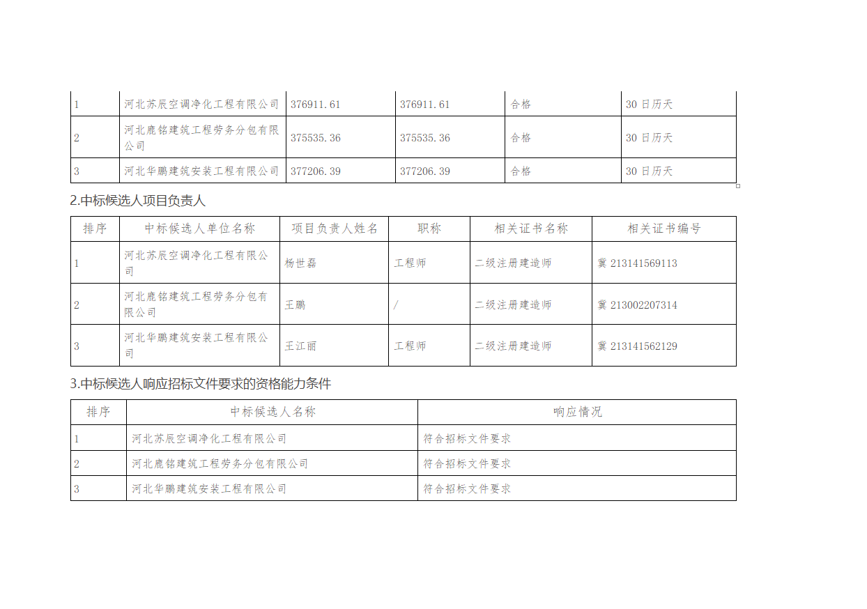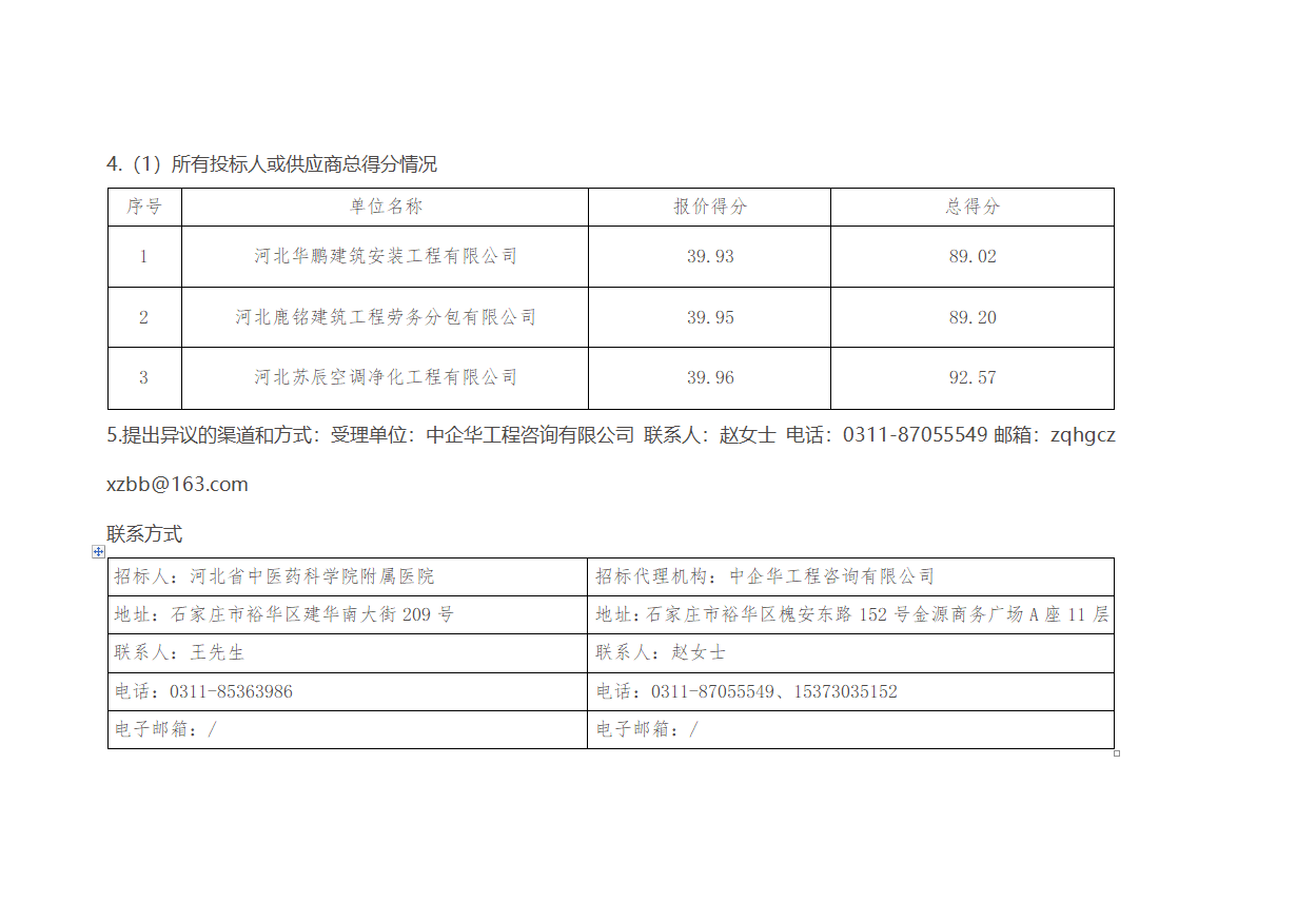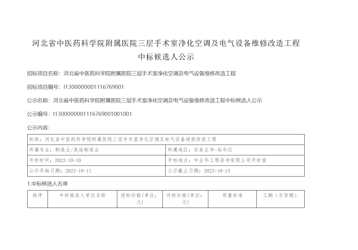 河北省中医药科学院附属医院三层手术室净化空调及电气设备维修改造工程中标候选人公示