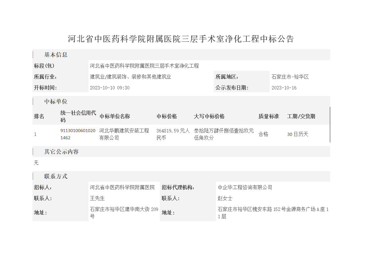 河北省中医药科学院附属医院三层手术室净化工程中标公告